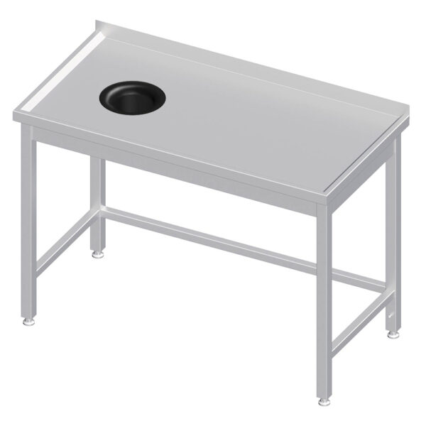 Im hektischen Küchenalltag ist der Arbeitstisch mit Abfallloch eine praktikable Lösung für einen schnell aufgeräumten, sauberen Arbeitsplatz. Der Gummiring des Abfalllochs ist entnehmbar, damit er einfach hygienisch gereinigt werden kann. Damit nichts daneben landet, ist die Arbeitsfläche von einem Wulstrand umzogen und hat eine rückseitige Aufkantung von 4 cm.