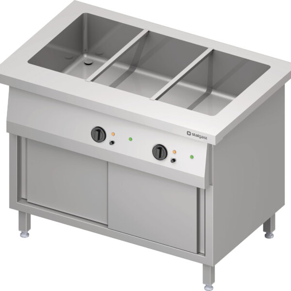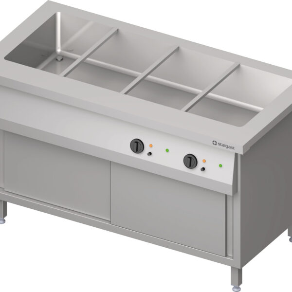 Bain-Marie-Station „Free Flow“ mit einem Becken 4x GN1/1, Wärmeschrank und Schiebetüren, 1465x750x880 mm Edelstahlabdeckung