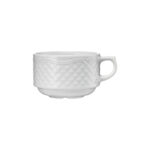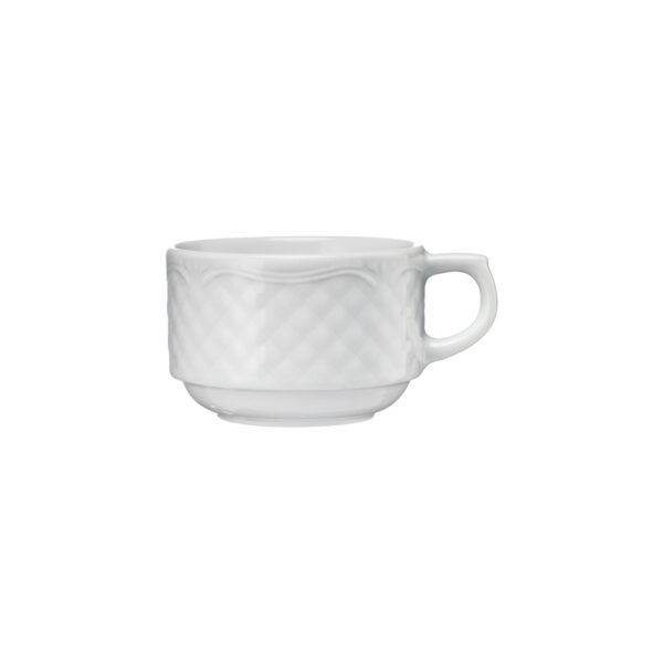 Die Tasse für Kaffee- oder Tee ist Bestandteil der umfangreichen Porzellanserie Aphrodite.Das elegante, von geschweiften Linien und stilisierten Blättern gerahmte Waffelrelief machen das Geschirr zu einem Blickfang auf Ihrer stilvoll gedeckten Tafel.Das umfangreiche Sortiment des Services Aphrodite bietet eine Vielzahl an variabel einsetzbaren Geschirren. Stellen Sie ganz nach Ihren Bedürfnissen die perfekte Grundausstattung für Ihre Restauration zusammen und profitieren Sie von den vielen Vorteilen.Das hochwertige Reliefporzellan ist stoß- und abriebfest, verstärkte Ränder schützen vor Abplatzungen. Eine niedrige Wärmeleitfähigkeit sorgt für ein langsameres Abkühlen von Speisen und Getränken. Alle Einzelteile sind stapelbar und können platzsparend gelagert werden. Die gesamte Aphrodite-Porzellanlinie ist EU-standardisiert für alle gängigen Geschirrspüler. Bestellen Sie auch die zugehörige Untertasse (PZ5008160)!