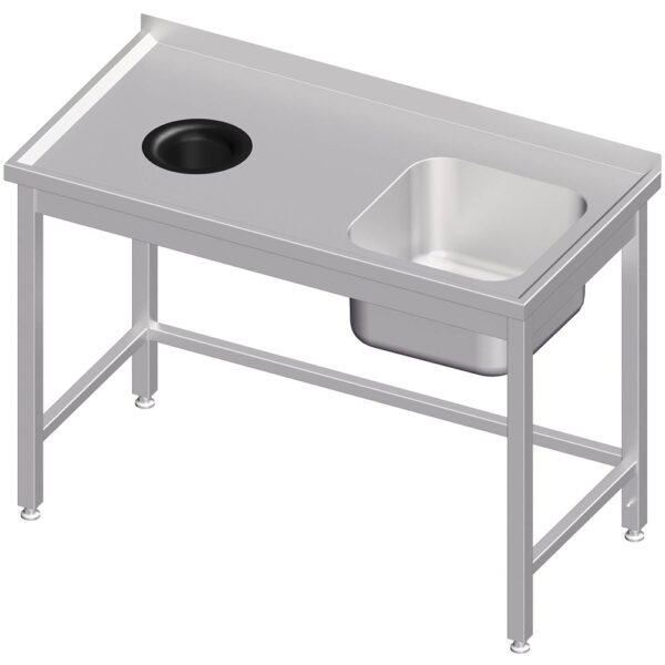 Der in Polen produzierte Spültisch von der Firma Stalgast ist fest verschweißt und hat eine Plattenstärke von mindestens 1,2 mm. In der mit Omegaprofilen verstärkten Abtropffläche ist ein Abfallschacht mit einem Durchmesser von 140 mm und einem herausnehmbaren Gummiring integriert.