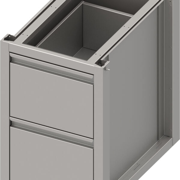 Die stabilen Schubladen mit gleicher Höhe sind geeignet für GN 2/3-Behälter von max. 150 Höhe und lassen sich dank der Kugelführung leichtgängig voll ausziehen.